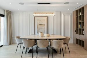 Consisting of three levels. A ground floor with an open plan layout throughout the kitchen, dining and living area provides a sociable and user-friendly space. A beautifully crafted kitchen of the highest quality with book matched porcelain worktops, Gaggenau appliances and underfloor heating. A formal dining area for up to 8 people and cosy living room complemented by customer made furniture unique to this project completes this floor.