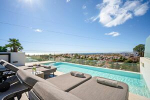 Designed to blur the boundaries between indoor and outdoor living, the residence features an expansive covered terrace ideal for dining and entertaining with family and friends. The bespoke rooftop solarium, complete with a private pool and breathtaking panoramic views over the Mediterranean Sea, Gibraltar, Africa, and Marbella’s iconic La Concha mountain.