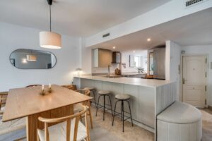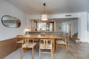 On the ground floor, you will find a fully renovated open-plan kitchen, spacious and modern, seamlessly connected to the living–dining area. From here, you can access a large rear terrace, perfect for outdoor dining, as well as a guest toilet. At the front of the house, there is a peaceful patio furnished with outdoor sofas—an ideal spot to relax.