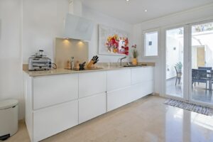 Arriving at the property, you enter through a spacious courtyard which enjoys a delightful covered area. Entering the house, you will find the spacious open plan lounge, dining area & kitchen, leading out to the sunny terrace. Downstairs you will find three spacious double bedrooms, all with fitted wardrobes and enjoying access to a private sun terrace. The master bedroom has an ensuite bathroom, with a second bathroom on the bedroom level for family & friends to enjoy. Just off the entrance courtyard, this property boasts a self contained annex offering a bedroom and bathroom, ideal for a nanny or simply a guest room.