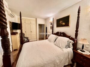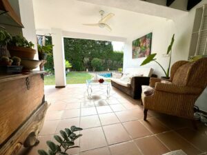 Adjacent is the generous kitchen, boasting rustic touches and modern amenities and ample space for a table that can comfortably accommodate up to 8 people. The private garage is ample for two cars while also serving as a pantry and storage with wall shelving. This villa is distributed with four bedrooms – 3 boast en-suite bathrooms, offering privacy and comfort, while a versatile storage room near the kitchen provides potential for additional living space.