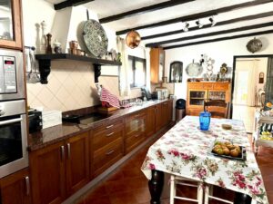 As you enter you are greeted by the front door porch, surrounded by terrace and greenery, with an olive tree as the center of the stage as you walk in. Through themain entrance, the hall welcomes you into an ample living room which is the heart of the villa, featuring an enclosed wood-burning fireplace. The dining room sets the stage for memorable gatherings and intimate meals, adorned with traditional wooden beams and with plenty of natural light.