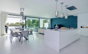 The ground floor features a bright open-plan living and dining area with a luxury Siemens-fitted kitchen, plus two guest bedrooms with en-suite bathrooms, guest toilet. Large sliding doors lead to the south-facing garden and terraces, complete with outdoor dining area, lounge seating, gas barbecue, and beautifully maintained garden.