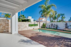Stunning four bedroom, beachside contemporary style Villa located in Costalita, Estepona. This luxurious south facing property has been recently renovated to a high standard in 2024. With four spacious bedrooms, three bathrooms, and an additional guest toilet. The interiors are thoughtfully designed, featuring a bright living room with fireplace and an open plan kitchen. Leading on from the living area, there is direct access to a beautifully landscaped private garden and swimming pool. There is also a large private terrace from the main bedrooms offering spectacular views of the Mediterranean Sea. The lower level of the property has a fantastic multi purpose space with laundry area and could be used as an additional bedroom, gym or games room. Other features include; underfloor heating in the bathrooms, sliding glass doors, air-conditioning, private garage with one parking space plus driveway for a further three cars. Conveniently located near amenities, shops, schools, and golf courses, and just a short walk from the beach.