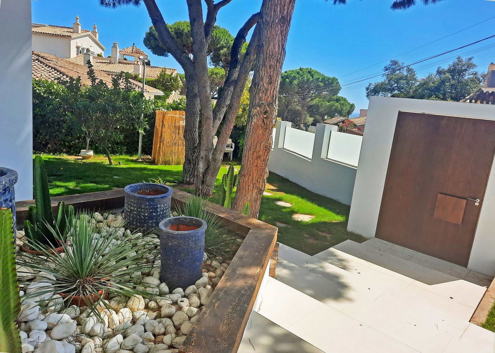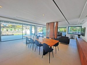 Elegant Interior Design: Enter through a striking wooden door into a bright and welcoming hallway, leading to a beautifully lit staircase. Descend to the expansive open-plan lower level, featuring a state-of-the-art kitchen, dining area, living space, and a stylish bar. Floor-to-ceiling windows flood the space with natural light and provide seamless access to the garden and pool area, creating a harmonious indoor-outdoor living experience.