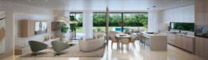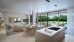 A wide, bright and highly functional social space enhanced by large panoramic windows with direct access to the garden and swimming pool.