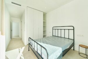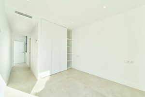 The first floor is dedicated to the main sleeping quarters, including a spacious master bedroom with en-suite bathroom and private terrace, along with additional guest bedrooms designed for comfort and privacy. Above, a generous rooftop solarium provides a versatile outdoor space ideal for sunbathing, entertaining or creating a chill-out lounge with open views of the surrounding residential area.