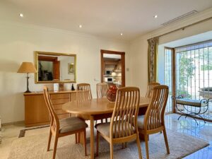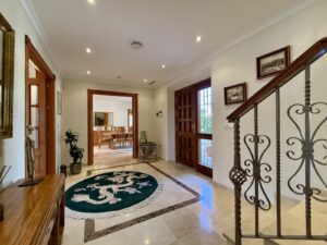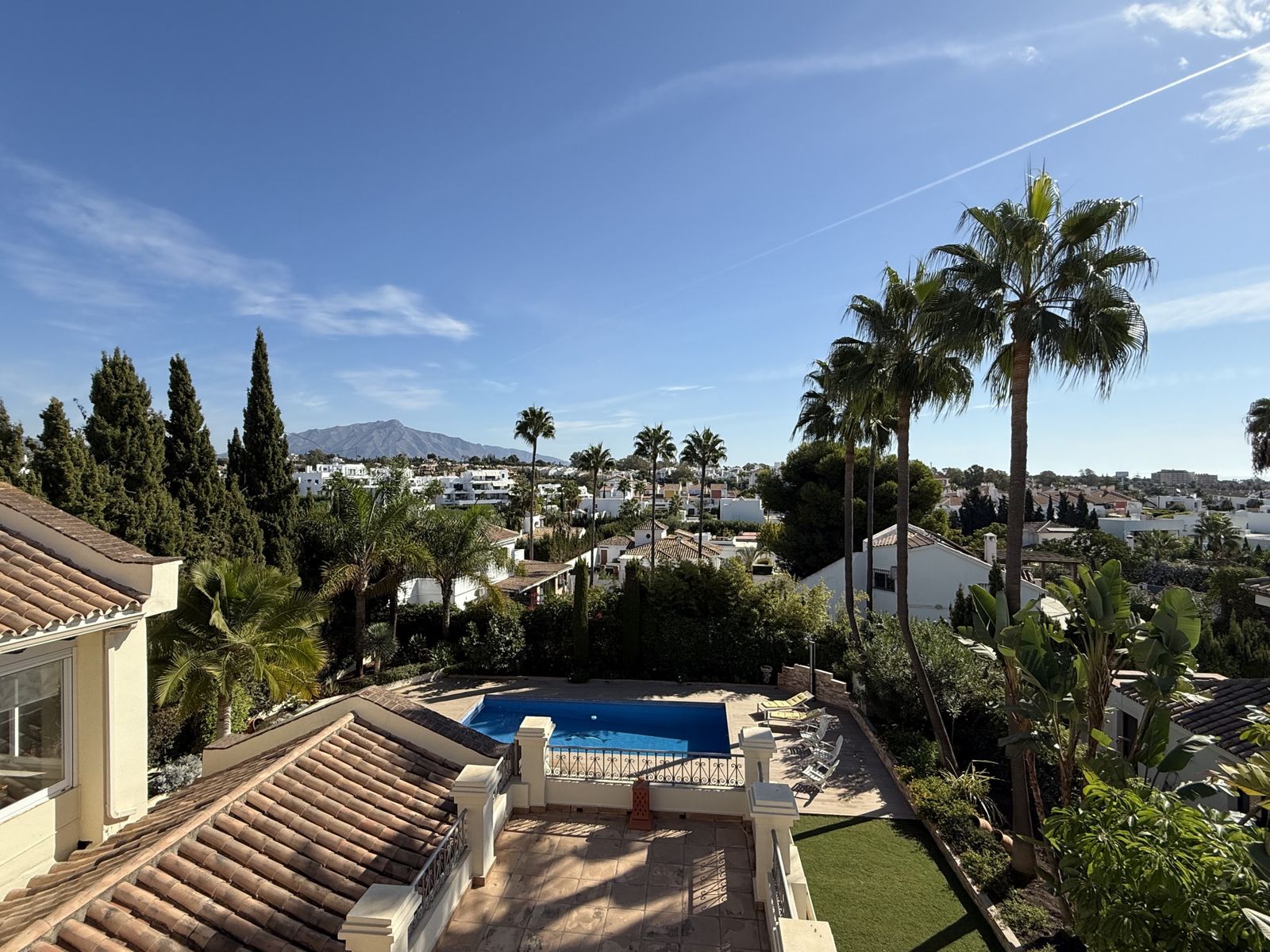 This great property has just come to the market at a very competitive price. It's an Ideal location, walking distance to several commercial centers make it very desirable for those who don't want to take the car to enjoy facilities and restaurants, supermarket, pharmacy, gym or a nice coffee shop. The property is in a lovely condition. The villa has a nice elegant andalusian style. The entrance hall connect to the right with the separate dining room, the fully fitted kitchen ad the large covered and uncovered terrace to the landscaped mature and very private garden and pool. The spacious living room has a high ceiling with wooden beams. On the same level we find two bedrooms with en suite bathroom. A nice stair case bring us up tot he first floor where we find a large and very bright bedroom and the master bedroom with , ensuite bathroom and access to a large very sunny uncovered terrace with lovely mountain views. Going down to the basement we find a games room, a hobby room with bathroom and the very large garage for several cars. Also the utility room. This great family property enjoys a fantastic mature garden and a lovely entrance area. International schools like Atalaya, San José in Guadalmina are just nearby. Proximity to all facilities as several golf courses like El Paraiso, Atalaya or los Flamingos, the beach at 15 minutes walk, The lovely El Campanario sport club with fantastic indoor pool, gym, spa and much more make this a unique family home. A visit is highly recommended.