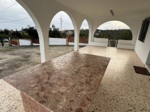 The main residence features a built area of 190 m², distributed across four bright bedrooms and a full bathroom. The heart of the villa is its spacious living room with a fireplace, perfect for family gatherings or enjoying pleasant evenings in winter. Additionally, the property requires renovation, presenting an excellent opportunity to personalize the spaces and adapt the home to the needs and tastes of the future owner.