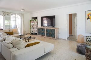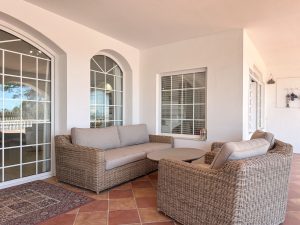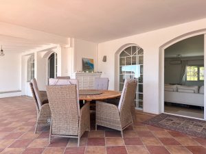 The spacious and bright living room opens onto a large terrace of 150m2 at the front of the house, where you will find a 40 m² swimming pool surrounded by plenty of space for sunbathing. From the living room there is also access to a large covered terrace of 65 m², ideal for outdoor dining, relaxing in the shade, or enjoying the mild Mediterranean climate throughout the year.