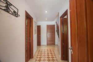 Inside, the home opens with an entrance hall and a guest toilet. This leads into a bright and spacious living room with large windows and direct access to the terrace, offering views over the garden and pool area. On this floor you will also find a modern and generous open-plan kitchen, fully equipped and finished with high-quality materials.