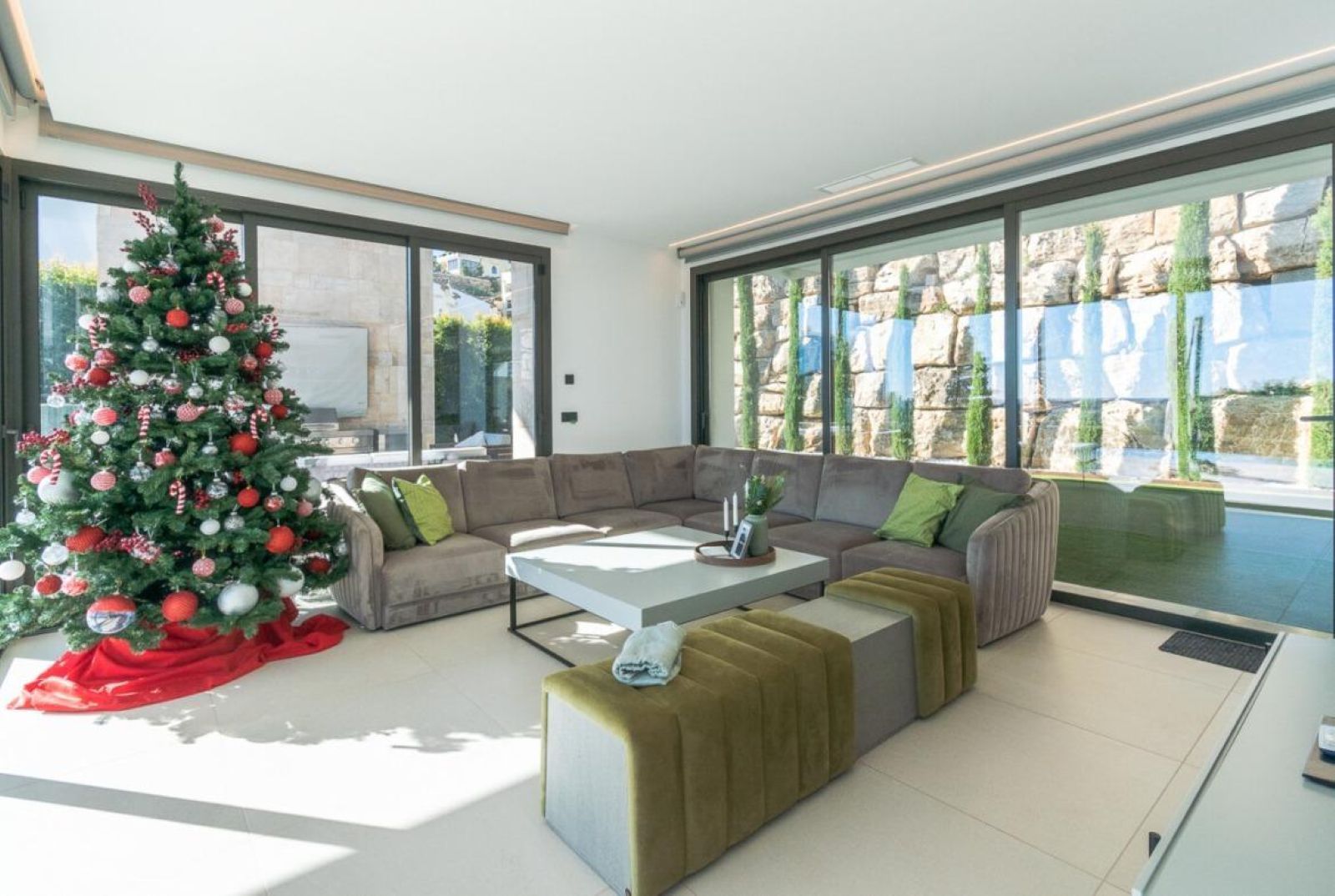 The villa features four spacious double bedrooms, each designed with sophistication, and four fully equipped bathrooms finished with high-end materials. The interiors are bright and airy, enhanced by large floor-to-ceiling windows that offer breathtaking views of the Mediterranean Sea and surrounding mountains.