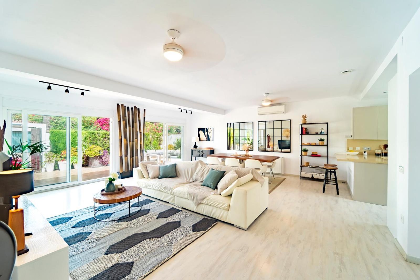 Upon entering, you are greeted by a spacious living area. The kitchen, which opens onto a terrace, is perfect for outdoor dining and entertaining.