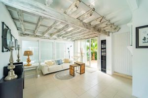 The master bedroom features an en-suite bathroom and direct access to the garden and pool area, providing a private retreat. Additionally, there is another bedroom with an en-suite bathroom, while the remaining two bedrooms share a full bathroom.