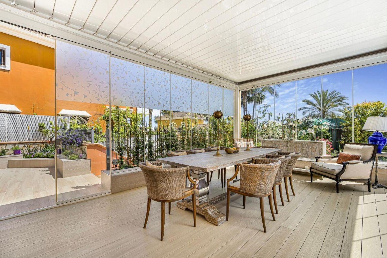 Impressive hall area with guest toilet leading to the main living room with fireplace. On one side is a private office room, on the other side a beautiful fully fitted kitchen with breakfast area and access to the front terrace with large dining area which has glass curtains.