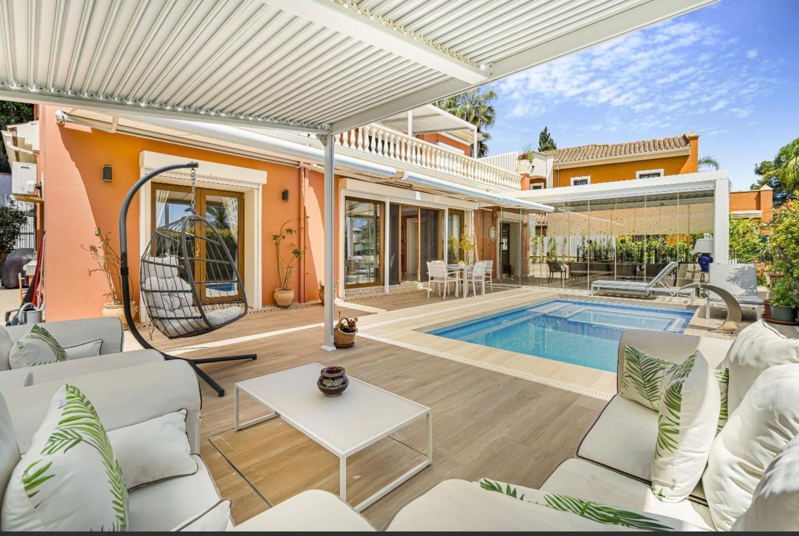 Outdoor amenities include a swimming pool, seating area, barbecue space, and a well-maintained wraparound garden