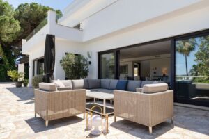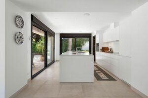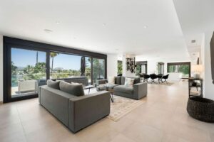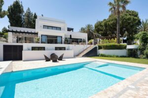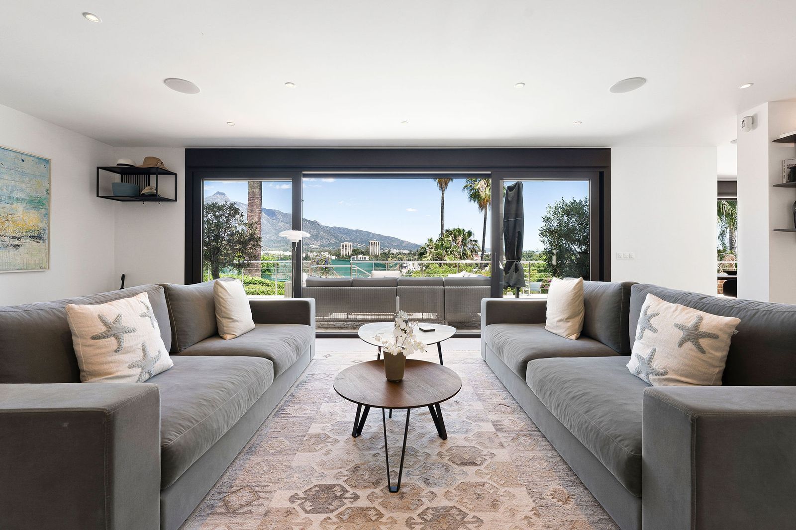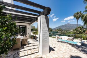A contemporary villa located in the heart of Nueva Andalucia, within walking distance to amenities including supermarkets, restaurants and Centro Plaza Commercial Centre and just few minutes’ drive to the best golf courses in the area. This property has a South-East orientation with sun all day on the pool and stunning views of La Concha Mountain and towards the sea. Built over three floors, the main level features an open-plan design with spacious living areas leading directly out onto the large terrace with various seated areas ideal for entertaining, two guest bedrooms suites and a guest toilet. Upstairs is dedicated to the large master bedroom suite with dressing area and private terrace. On the lower level there is a further guest bedroom with ensuite bathroom, guest toilet and games room. The garden area is easily maintained and carport for up to 3 cars.