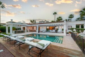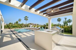 Welcome to a beautifully reimagined single-level villa nestled in the heart of Nueva Andalucía, just minutes from the renowned Los Naranjos Golf Course. Designed and developed by Casas Fintech, this exquisite 4-bedroom home merges Mediterranean elegance with contemporary comforts. Set on a lush, elevated plot, the villa offers privacy, tranquility, and breathtaking views across the valley to the sea, all while being moments away from Marbella’s best golf, dining, and beach experiences.