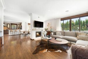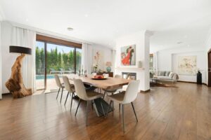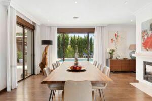 Step inside to a beautifully designed open-plan kitchen, dining, and living area, where natural light floods the space through large glass doors that open directly onto the terrace and pool. Whether you’re entertaining guests or enjoying a quiet family meal, the seamless indoor-outdoor flow creates a relaxed and sociable atmosphere. A cozy fireplace adds warmth and character, making the space inviting all year round.