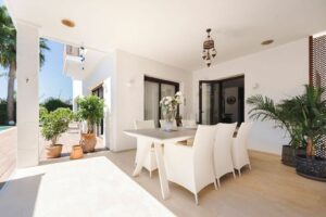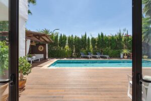 Outside, a private swimming pool is surrounded by lush greenery, sun loungers, and shaded areas — perfect for long, lazy afternoons or evening BBQs under the stars. The garden is low-maintenance yet full of charm, offering a peaceful oasis just minutes from the vibrant heart of San Pedro.