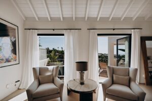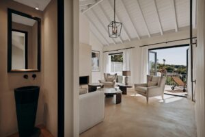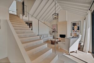 The entrance sets the tone with a private patio shaded by orange trees and flowering plants, creating a welcoming Mediterranean atmosphere. Inside, the main living area impresses with high ceilings, a real fireplace, and uninterrupted sea views from every window and even from the sofa. The modern kitchen, fitted with premium international brands, connects seamlessly to the dining room and opens onto a south-facing terrace with remote-controlled shades – ideal for enjoying Marbella’s mild climate year-round.