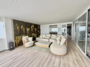 The stylish lounge area features floor-to-ceiling glass doors, flooding the space with natural light and leading directly onto the expansive terrace. This outdoor haven is a true highlight of the property, furnished in a chic lounge style and enhanced by an eco-friendly fire pit and a dramatic moss wall art installation. From here, enjoy front-row views over the iconic Puerto Banús marina, yachts, and sea beyond—day or night.