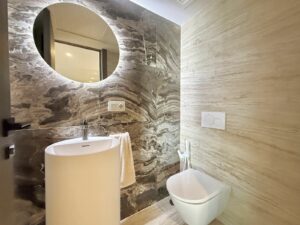 All five bedrooms are generously proportioned, each with high-quality built-in wardrobes, offering privacy and comfort for family or guests. The bathrooms are finished to an exceptional standard, showcasing Italian marble walls and the latest-generation stoneware, creating a serene, spa-like atmosphere throughout.