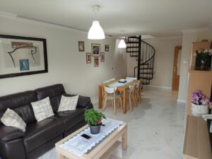 The residence features five bedrooms, one of which includes an en-suite bathroom and a walk-in closet, and three bathrooms in total, making it an ideal option for large families or those seeking additional space for guests. The main living room is spacious and bright, connected to a private terrace and a solarium on the upper floor, perfect for enjoying the Mediterranean climate. The kitchen is fully equipped and furnished, ready for immediate use, and includes a barbecue area for outdoor gatherings.