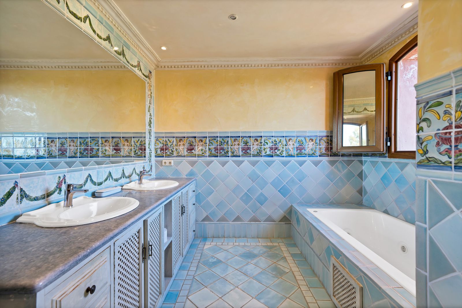 Handcrafted stucco walls.