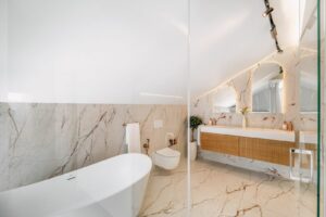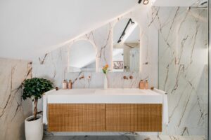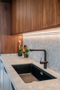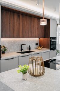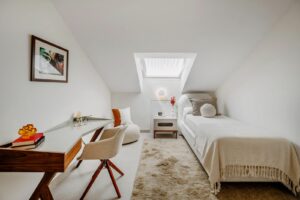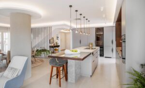 The refurbishment, completed in 2025, combines natural materials, walnut wood details, and warm lighting to create a calm, modern interior. The main floor features an open-plan living and dining space with a well-equipped kitchen, including Siemens appliances, a stone island, double fridge, integrated wine cooler, and a separate butler’s pantry.