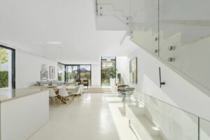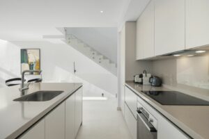 The ground floor’s contemporary kitchen allows for sociable cooking experiences, with easy interaction across the open-plan living spaces. The lower level features two bedrooms sharing a bathroom, cleverly designed to benefit from ample natural light and fresh air. This level also includes a dedicated TV lounge, perfect for quiet evenings or family entertainment.