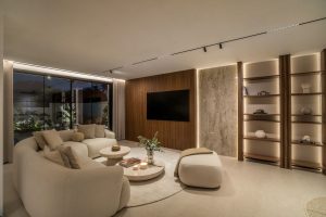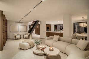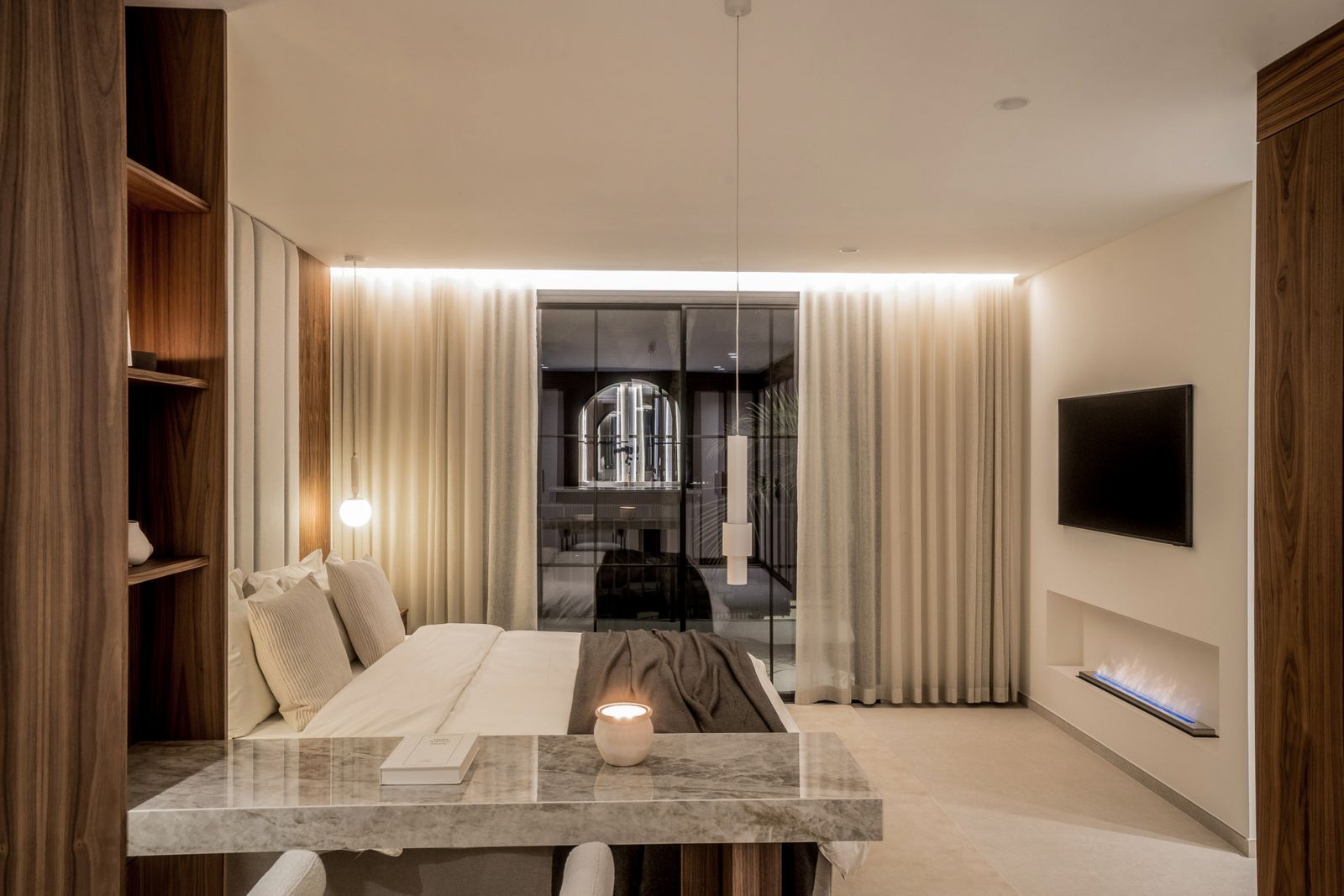 The ground floor also offers a guest bedroom with en-suite bathroom, a stylish guest WC, and a practical laundry area. On the upper level, you’ll find the luxurious master suite, two additional bedrooms with a shared bathroom, private terraces, and access to the rooftop solarium offering panoramic views.