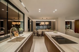 Spanning a total built area of 430 m², with 220 m² of interior space, the villa features five generously sized bedrooms and has been finished to the highest standards—ready to move in and enjoy. Upon entering, you're welcomed into an elegant hallway leading to a spacious living and dining area, complemented by a sleek open-plan kitchen by Licht, outfitted with premium Miele appliances.