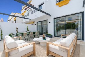 Outdoors, the property boasts two generous terraces—one at the front and one at the rear—both furnished with designer outdoor pieces and elegant dining areas, perfect for enjoying unforgettable evenings surrounded by tranquility and the gentle Mediterranean breeze. The house is sold fully furnished, with a state-of-the-art fully equipped kitchen and modern systems, including air conditioning, ensuring an exceptional living experience.