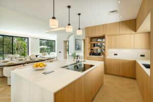 Two distinctive lounges provide versatility for family relaxation or social gatherings. Each has been furnished with custom-designed Eichholtz pieces, offering a refined yet welcoming atmosphere. The formal dining area leads to a bespoke KoK Studio kitchen fitted with Gaggenau appliances, natural wood cabinetry, and a secondary preparation area perfect for entertaining or everyday use. Throughout the property, Scandinavian oak and porcelain flooring, Fujitsu inverter air-conditioning, and underfloor heating ensure a consistent level of comfort and elegance.