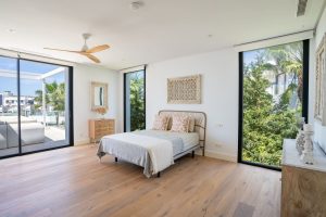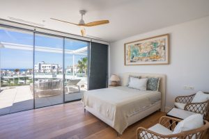 The residence comprises five well-appointed bedrooms, each with its own en-suite bathroom, providing privacy and comfort for all occupants. The bathrooms and living areas benefit from underfloor heating throughout, ensuring year-round comfort, while air conditioning and double glazing further enhance the living environment. The villa features elegant wooden floors and fitted wardrobes, adding to the sense of luxury and practicality.
