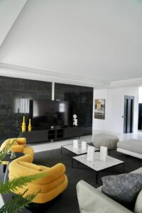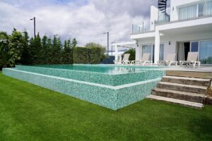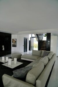 Indoors, the villa features bright, open spaces equipped with home automation, air conditioning, marble floors, jacuzzi, gym, games room, wine cellar, staff accommodation, and a fully fitted kitchen. The property is sold fully furnished with carefully selected high-end pieces.