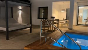 Outside, the property boasts a fully renovated heated swimming pool, ideal for year-round enjoyment. There is also a barbecue area and a chill-out space with a Balinese bed — perfect for relaxing and enjoying the Mediterranean climate.