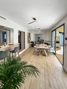 It offers 3 bedrooms, 2 bathrooms, a spacious living-dining room with TV area, and a modern fully equipped kitchen with Siemens appliances. The entire house benefits from underfloor heating, air conditioning, and state-of-the-art solar panels capable of generating enough energy to run the property without external electricity consumption.