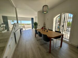 On the upper floor you find the main bedroom with a large bathroom with underfloor heating and a terrace with pergola from where you have lovely sea views.