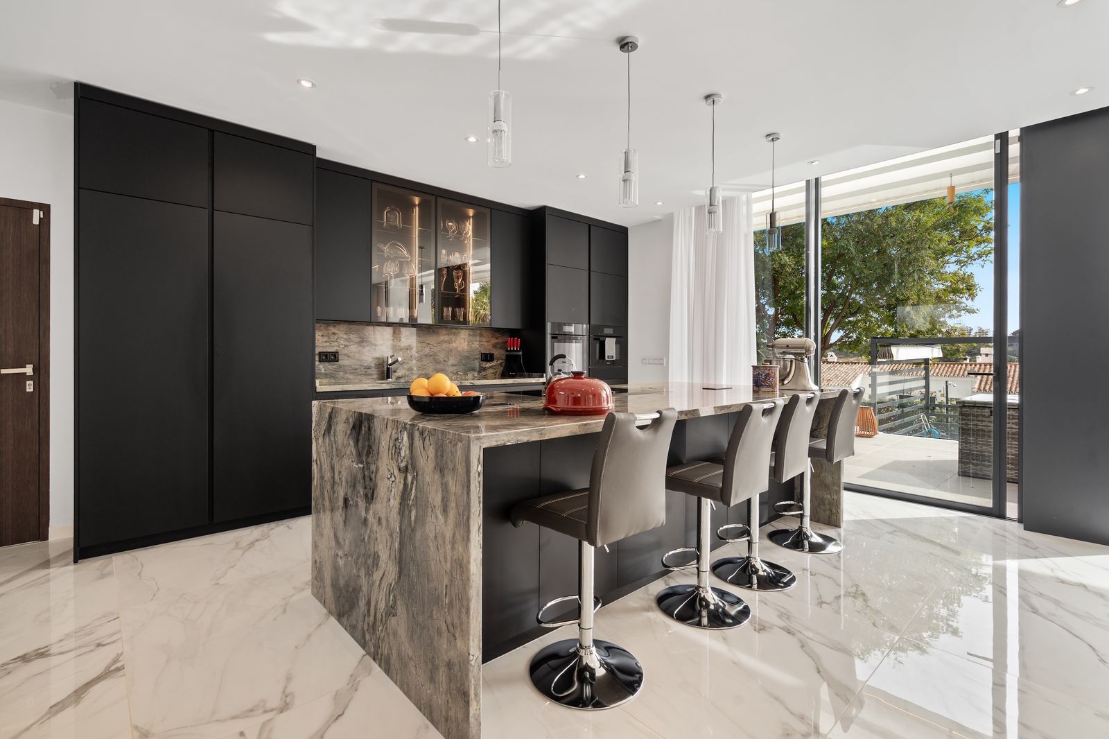 The lower level is designed for both comfort and leisure, offering a private gym and spa area with sauna, jacuzzi, and hammam, along with entertainment spaces, staff accommodation, storage, and utility rooms. The villa is equipped with underfloor heating, advanced climate control, double glazing, and a fireplace. Energy efficiency is enhanced through photovoltaic solar panels with FVE battery system and solar water heating.