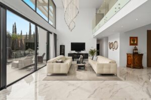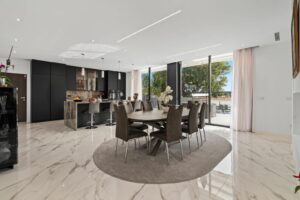 The property has a total built area of 980 m², along with 152 m² of terraces. Its south-west orientation allows sunlight throughout the day and opens up views across the golf course, gardens, and surrounding mountains and sea. Inside, the villa features five spacious bedrooms and seven bathrooms, all finished to a high standard.