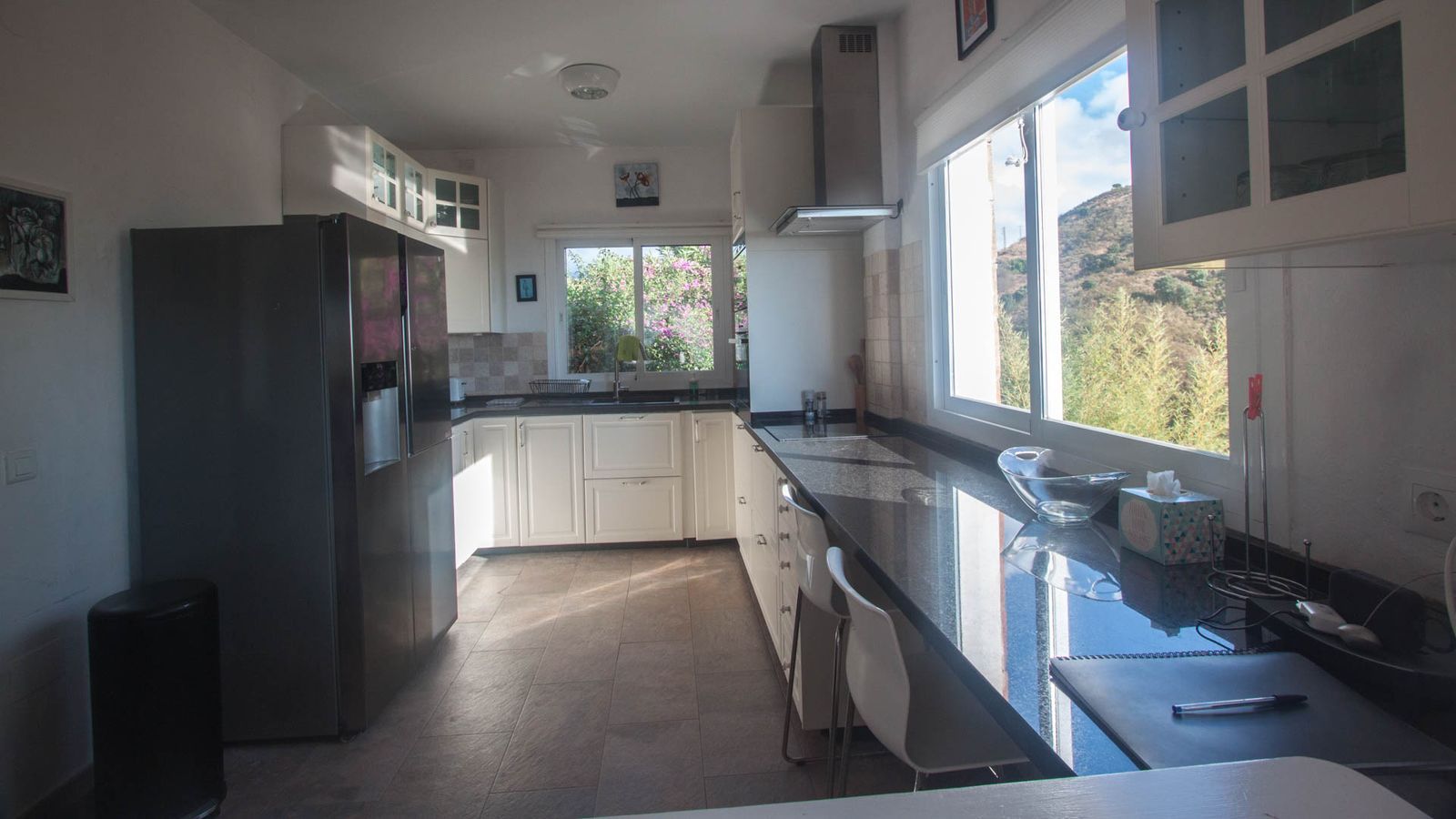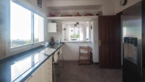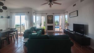 • Bright and spacious living room with fireplace, large windows, and sliding glass doors that open onto a covered porch with direct access to the pool and gardens – ideal for enjoying the sea views all year round.