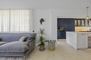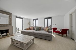 On the ground floor, a state-of-the-art kitchen with a stylish central island and breakfast bar connects directly to a covered front terrace, making it ideal for alfresco dining. A separate utility room with a private toilet leads to the rear garden. The open-plan living and dining area is bathed in natural light and features a cosy fireplace, with direct access to another covered terrace. This level also includes a versatile guest bedroom or home office with an ensuite bathroom.