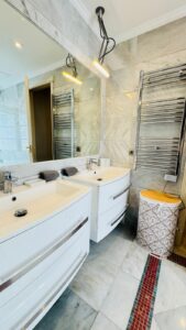 The fully fitted open-plan kitchen is modern and American-style, with a large central island, connecting seamlessly to the dining and living areas — perfect for everyday living and entertaining. The property is sold fully furnished and includes marble flooring, fitted wardrobes, air conditioning, fireplace, double glazing, electric blinds, Wi-Fi, utility room and private terraces.