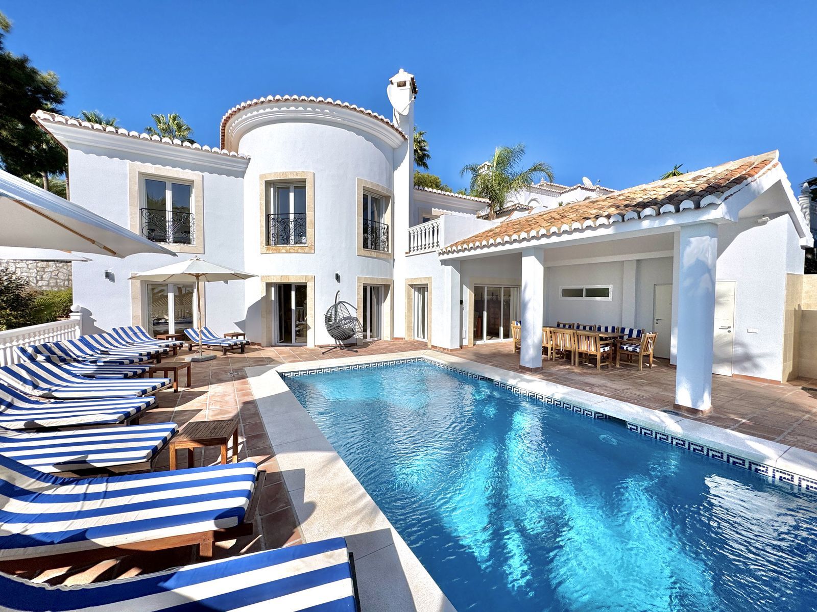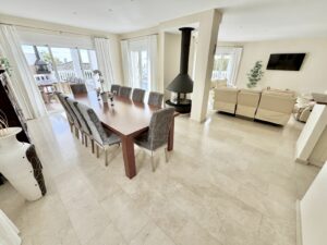This substantial south facing detached villa sits on a beautiful elevated corner plot in a quiet and sought after exclusive residential community, just 250m from the beach. You are also only approx 22 mins walk to La Cala’s main shopping / restaurant Boulevard. You enter the luxury development via impressive high electric double opening gates. The attractive and classy villa offers 5 spacious master bedrooms all with their own luxury ensuite bath or shower rooms and fitted wardrobes. The main level has a spacious open-plan layout, seamlessly connecting the living room, dining room and modern open plan kitchen. This amazing villa for sale also has an extra enormous entertaining area below the villa with windows, giving potential for a gym & cinema room or possibly even a guest apartment. The detached villa also has a good size garage area, hot & cold air-con, double glazing, outside BBQ kitchen, outside shower & toilet with sink, amazing outside covered entertaining area with high vaulted ceilings and the beautiful open patio garden / swimming pool area, all offering beautiful Mediterranean sea views. From the patio garden there is also a small lawned garden area. The exclusive gated community that this detached villa is set in, also features extensive beautifully landscaped gardens with a petanque / boules court and a putting green.