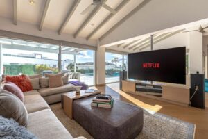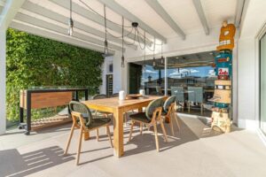 The main level welcomes you with a bright living room featuring a fireplace, a separate dining area, and direct access to covered and open terraces overlooking the garden and pool. A fully fitted Bulthaup kitchen provides ample storage and workspace, ideal for everyday living and entertaining. The villa offers five well-proportioned bedrooms, including a spacious master suite, and several bathrooms finished in a modern style.