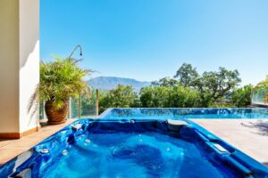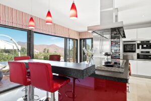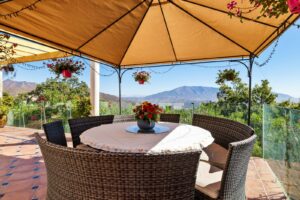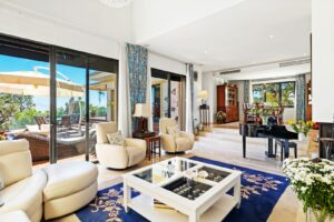 The villa has 5 bedrooms, 7 bathrooms, has a cinema room, office, gym, sauna, music room, games room, and much more. The kitchen opens to the pool and the beautiful views! The gardens are extensive, with swimming pool, jacuzzi, barbecue area, and views that can never be obstructed!