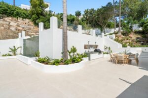 The villa’s second access point is located on the opposite side of the plot. A charming exterior staircase leads to a beautifully appointed outdoor kitchen with a dining area – perfect for refined al fresco dinners under the stars. Here, you'll also find the main entrance and the spectacular infinity pool – a true architectural masterpiece with sweeping views over the sea, the mountains, and the vibrant Puerto Banús marina.