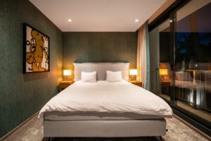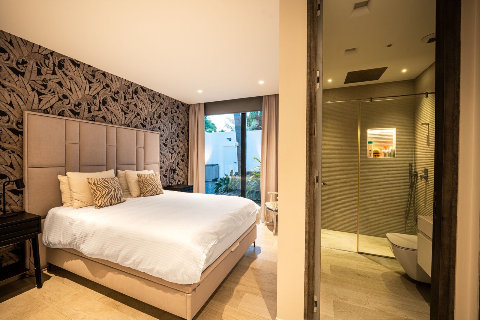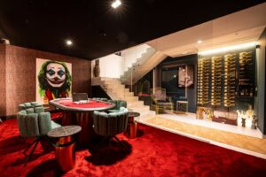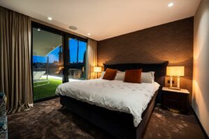 The villa has two guest bedrooms on the main floor, each with en-suite bathrooms and garden views. Upstairs, the master suite offers dual dressing rooms, a private office, and a large bathroom with a free-standing bathtub. The suite opens to a terrace with sweeping views. Another en-suite bedroom completes the upper floor. The basement level includes a private gym, cinema, wine cellar, and entertainment spaces, giving you everything you need for both relaxation and leisure.